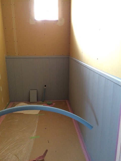 トイレはかわいくて少しシックなブルーグレーの腰壁を設置しました!