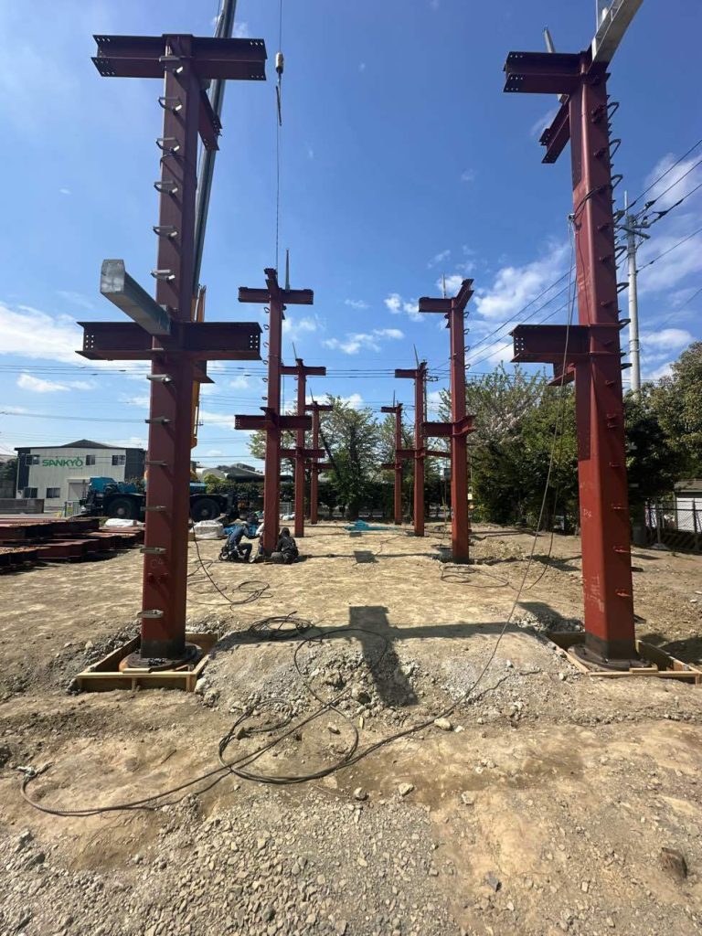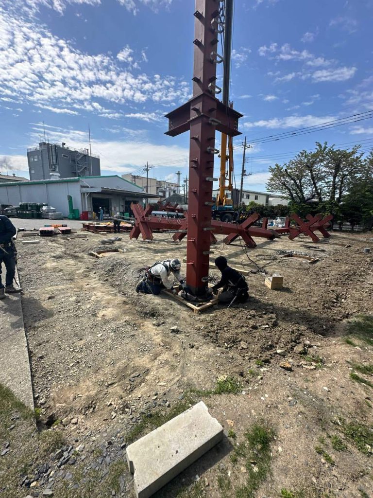 前回埋設した杭に構造鉄骨を接合していきます。