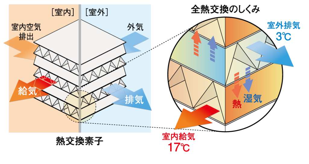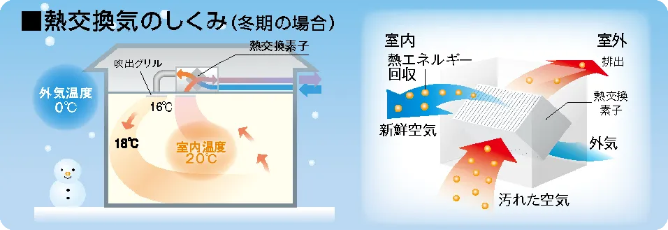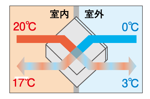 冬場、室温が20℃で外気気温が0℃の時、熱交換を行うことにより、室内に17℃の空気を給気します。