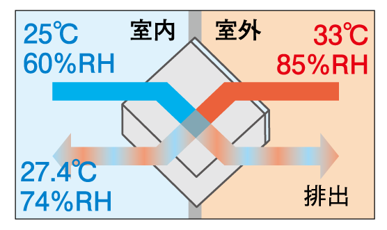 夏場、多湿な33℃の外気とエアコンにて除湿された室内の25℃の空気を全熱交換を行うと、多湿な外気を室内の除湿された空気に近づけ、部屋内に給気します。