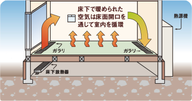 床下に温水式の放熱器を設置し、足元からのふく射と自然対流で部屋全体をやわらかく暖めます。