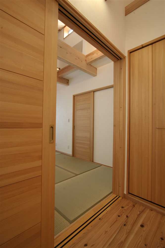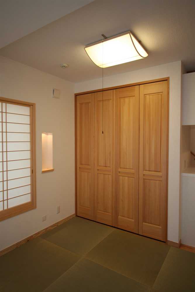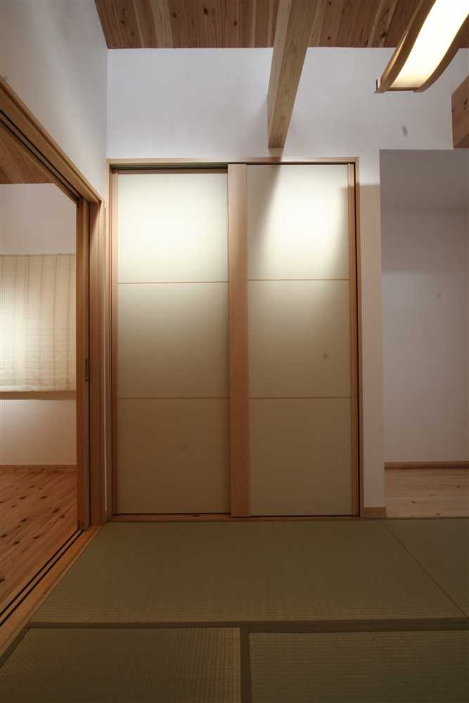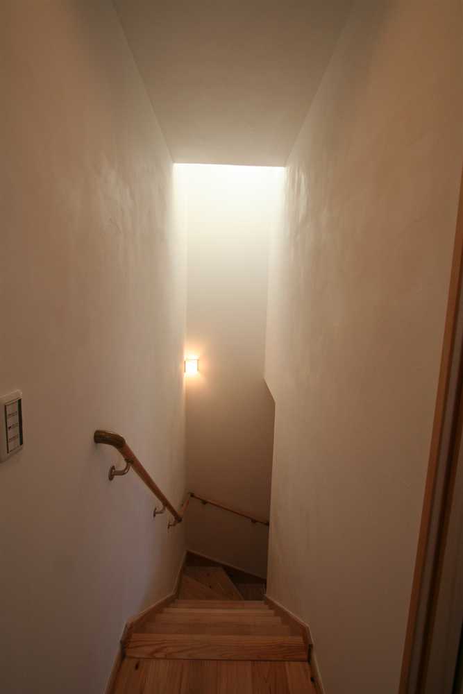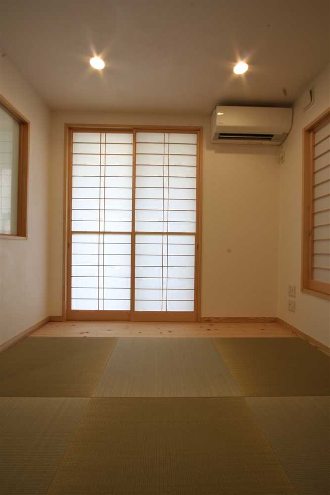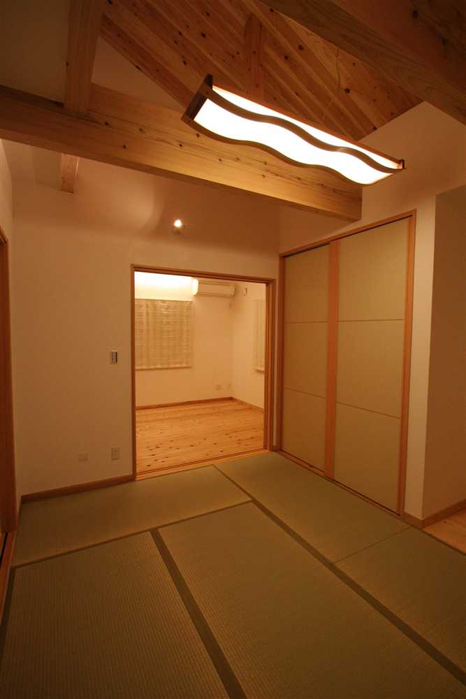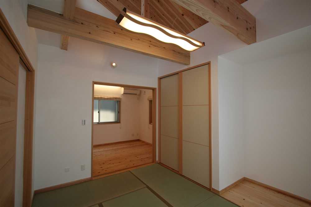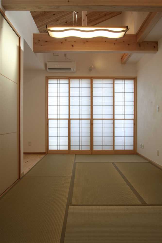 内装に使用したほたて漆喰は、調湿・消臭効果があり、健康と環境に優しい塗り壁材です。コテ仕上げの壁は、光が当たるとコテ跡に陰影ができ、安らぎの癒し効果をもたらします。床や2階の天井に用いた杉燻製熱処理材は、優しい肌触りや防腐、防虫効果があり、落ち着いた雰囲気を演出します。1階和室の照明、2階和室の琉球畳、外装のほたて漆喰+ガルバリウム鋼板のデザインなど、狭小住宅でありながら、個性溢れる家になりました。