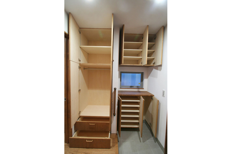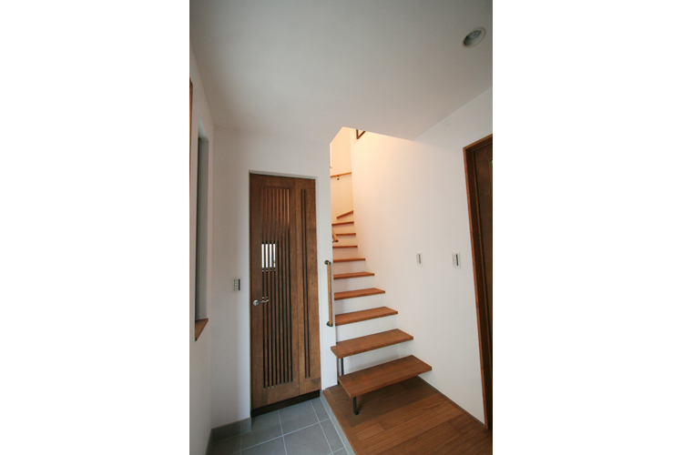 1階は親世帯、2階は子世帯で暮らす2世帯住居。玄関部分は共有で階段を上がると子世帯のリビングへとつながります。リビングが家の中心でそこにみんなが自然と集まるように各部屋を配置。キッチンはリビングがよく見える位置で、家事をしていてもコミュニケーションがとれるようになっています。