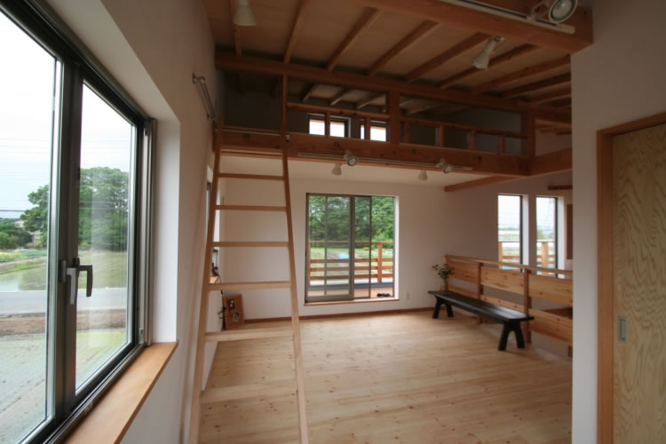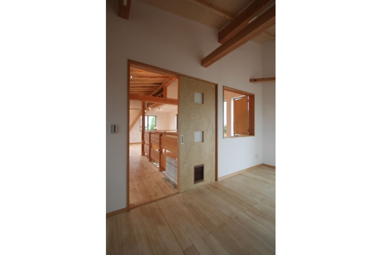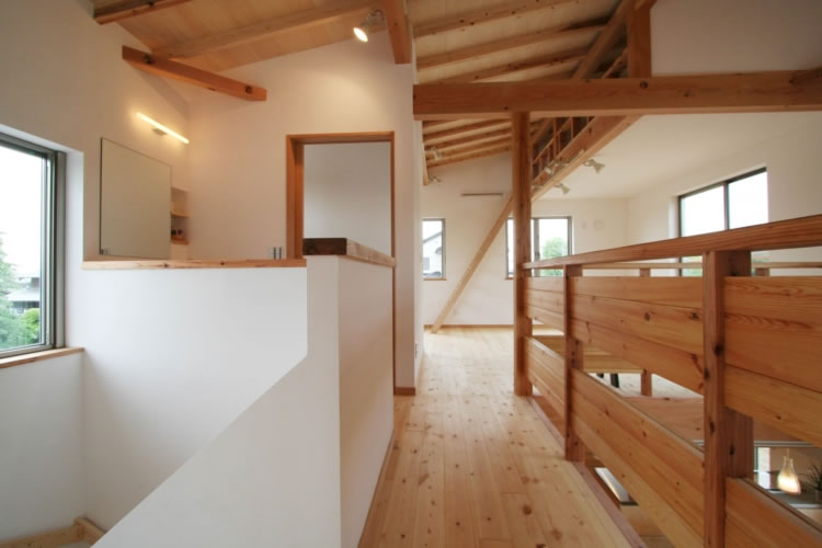 この家のこだわりはなんといっても吹抜けです。下から見上げると、2 階の表し仕上げまでの高さの空間が、なんと気持ちのいいことか。吹抜けの手摺は、見上げる側に 1階床と同じ桐材、2階から見下ろす側には子供室と同じパインが張られています。