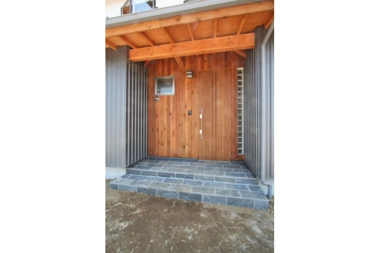 レッドシダーの玄関扉・壁、キッチン、吊戸棚の造作、天然石の床と桧材を張った壁・天井の浴室など、木をふんだんに使い、オリジナリティあふれる家になりました。