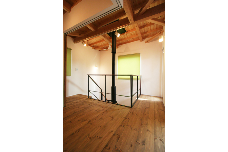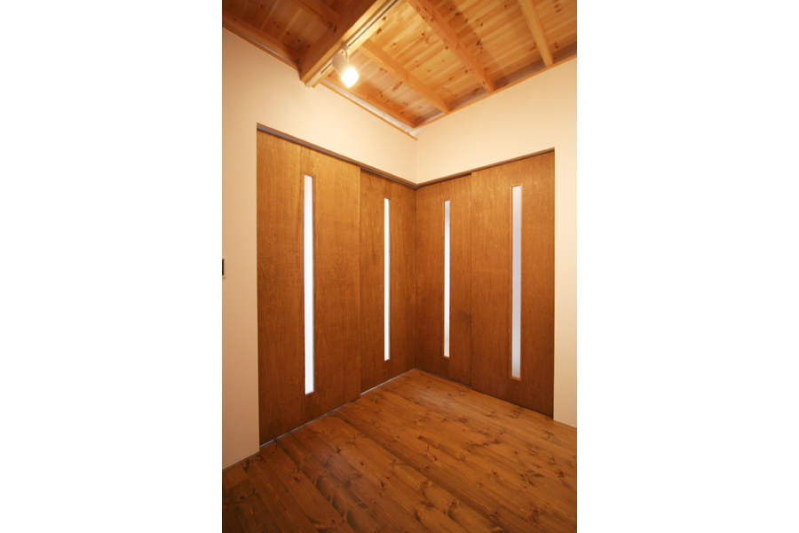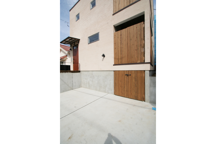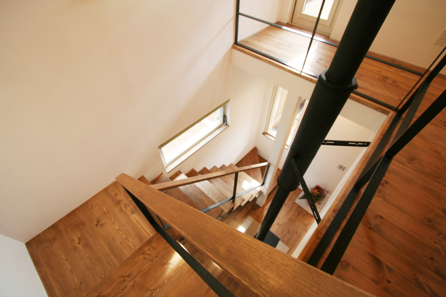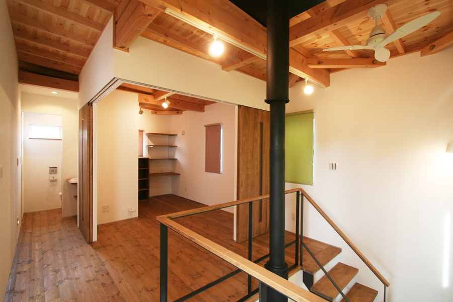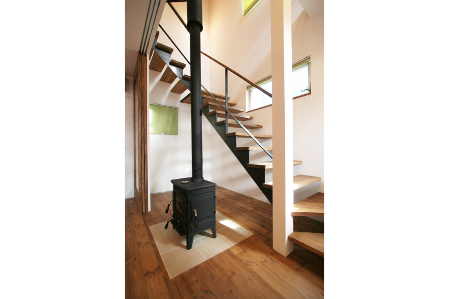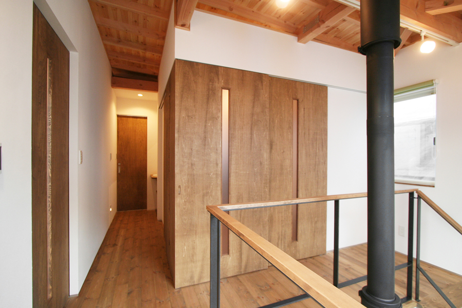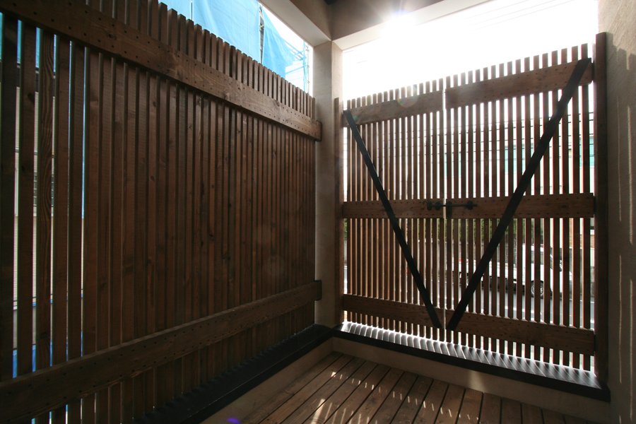 外観からインパクトがあるこの家は、三つの木製ルーバーが縦一列に並んでいます。高基礎になっている部分は、タイヤや薪などを収納する収納庫になっています。1Fと2Fはバルコニーになっており、ふだんは視線をさえぎるようにつくってありますが、1Fは開放することも出来ます。一気に開けた視界が開放感たっぷりで楽しい気分になること間違いなし♪外階段をのぼり室内に入ると、落ち着いたブラウンで全体をまとめてある中に、ロールスクリーンなどで遊び色をプラスしています。階段室には薪ストーブも設置し、冷暖房効率をあげるための建具も設置しました。2Fのお母様の部屋には畳スペースを設け、小上がりの仕様は腰をかけやすく、収納としても機能しています。遊びと過ごしやすさのバランスが絶妙な、大人が楽しい家になりました。