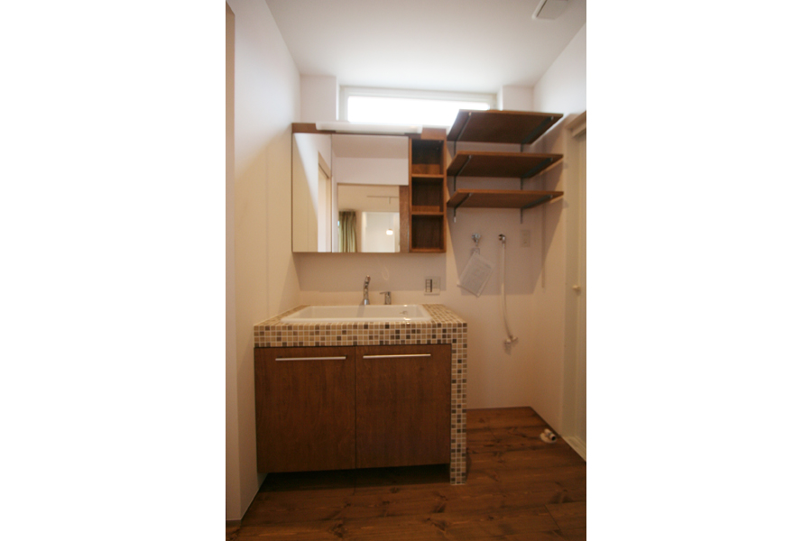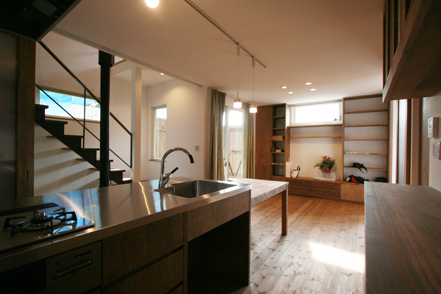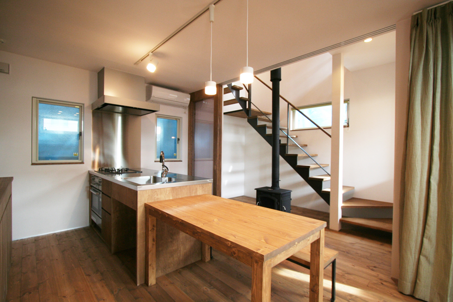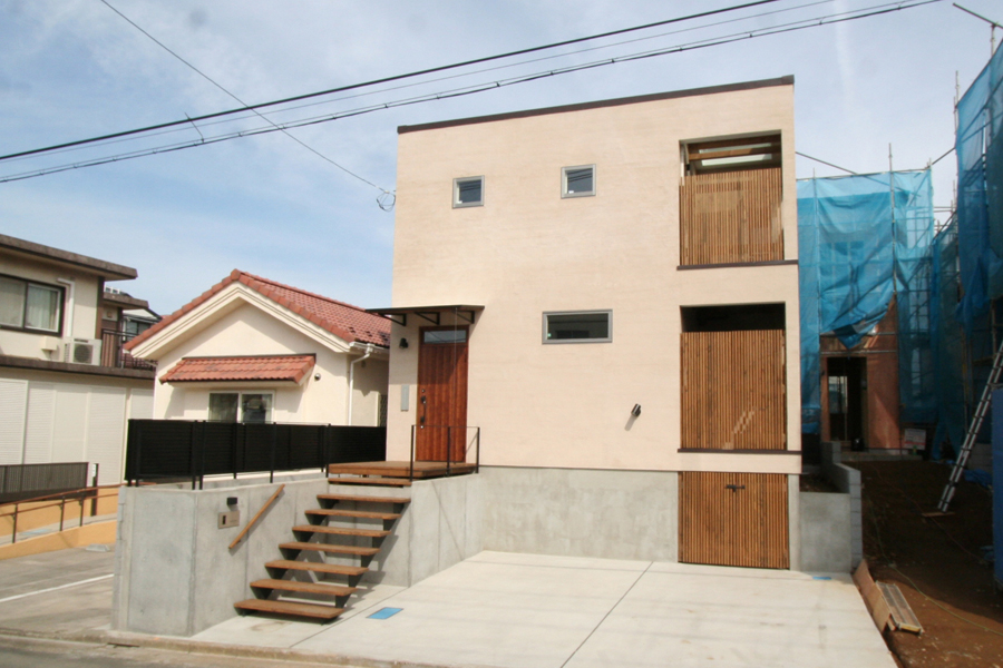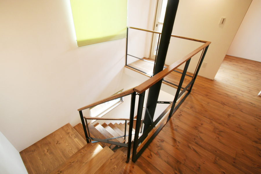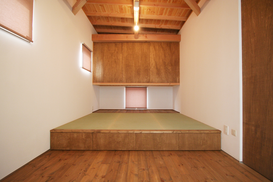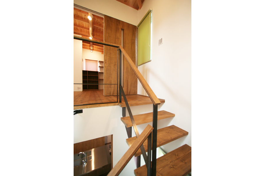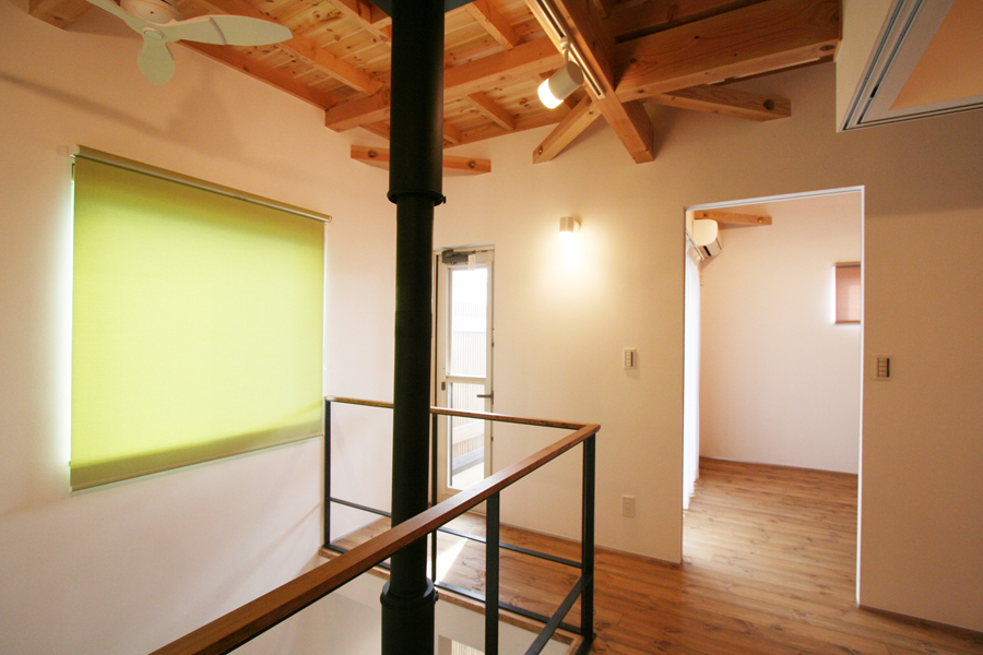 外観からインパクトがあるこの家は、三つの木製ルーバーが縦一列に並んでいます。高基礎になっている部分は、タイヤや薪などを収納する収納庫になっています。1Fと2Fはバルコニーになっており、ふだんは視線をさえぎるようにつくってありますが、1Fは開放することも出来ます。一気に開けた視界が開放感たっぷりで楽しい気分になること間違いなし♪外階段をのぼり室内に入ると、落ち着いたブラウンで全体をまとめてある中に、ロールスクリーンなどで遊び色をプラスしています。階段室には薪ストーブも設置し、冷暖房効率をあげるための建具も設置しました。2Fのお母様の部屋には畳スペースを設け、小上がりの仕様は腰をかけやすく、収納としても機能しています。遊びと過ごしやすさのバランスが絶妙な、大人が楽しい家になりました。