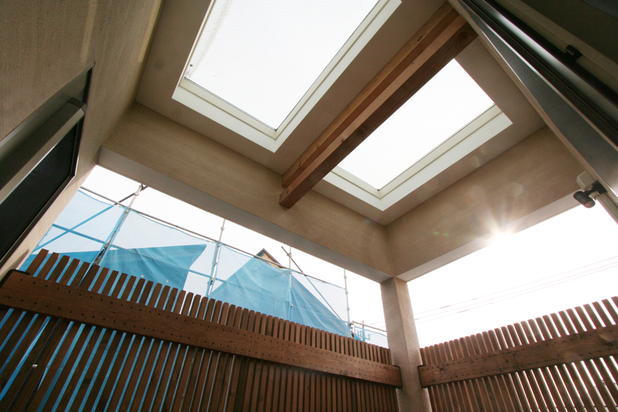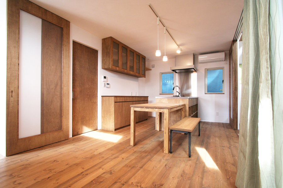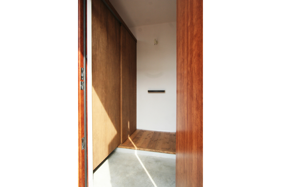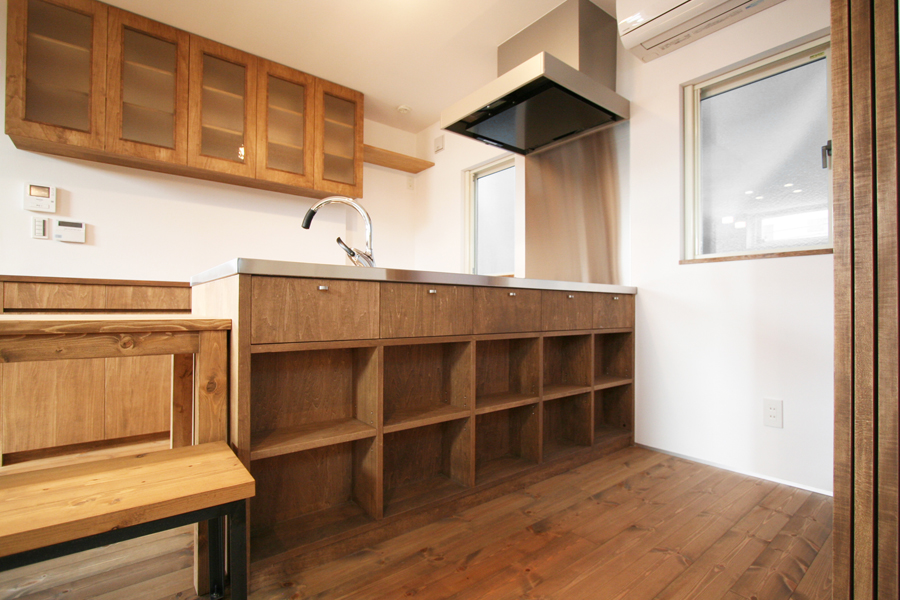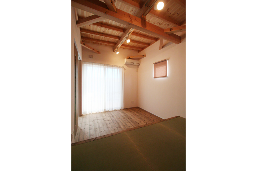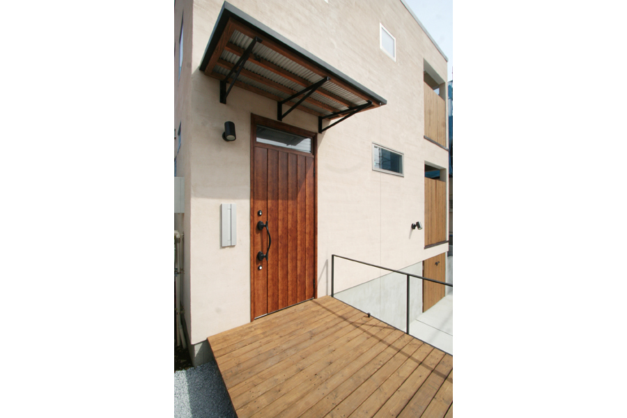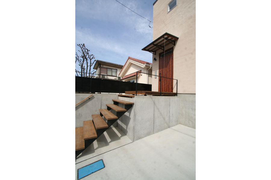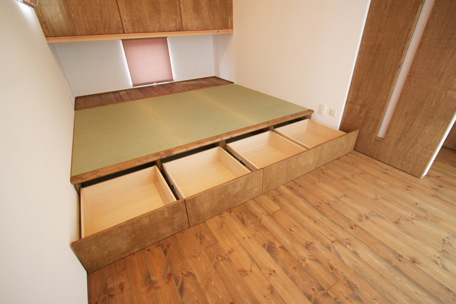 外観からインパクトがあるこの家は、三つの木製ルーバーが縦一列に並んでいます。高基礎になっている部分は、タイヤや薪などを収納する収納庫になっています。1Fと2Fはバルコニーになっており、ふだんは視線をさえぎるようにつくってありますが、1Fは開放することも出来ます。一気に開けた視界が開放感たっぷりで楽しい気分になること間違いなし♪外階段をのぼり室内に入ると、落ち着いたブラウンで全体をまとめてある中に、ロールスクリーンなどで遊び色をプラスしています。階段室には薪ストーブも設置し、冷暖房効率をあげるための建具も設置しました。2Fのお母様の部屋には畳スペースを設け、小上がりの仕様は腰をかけやすく、収納としても機能しています。遊びと過ごしやすさのバランスが絶妙な、大人が楽しい家になりました。