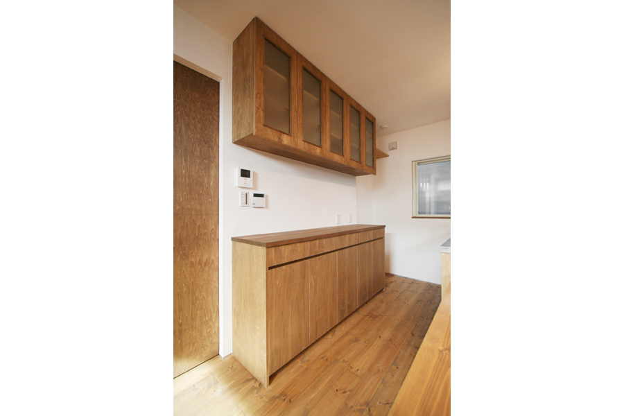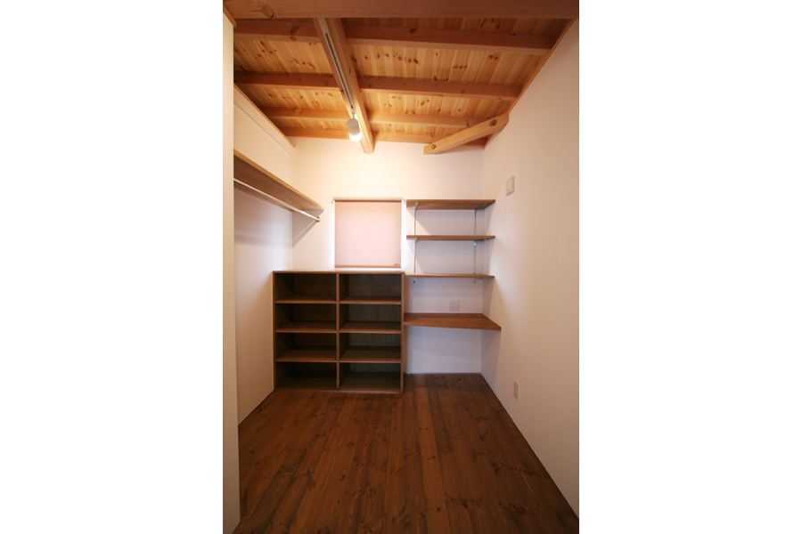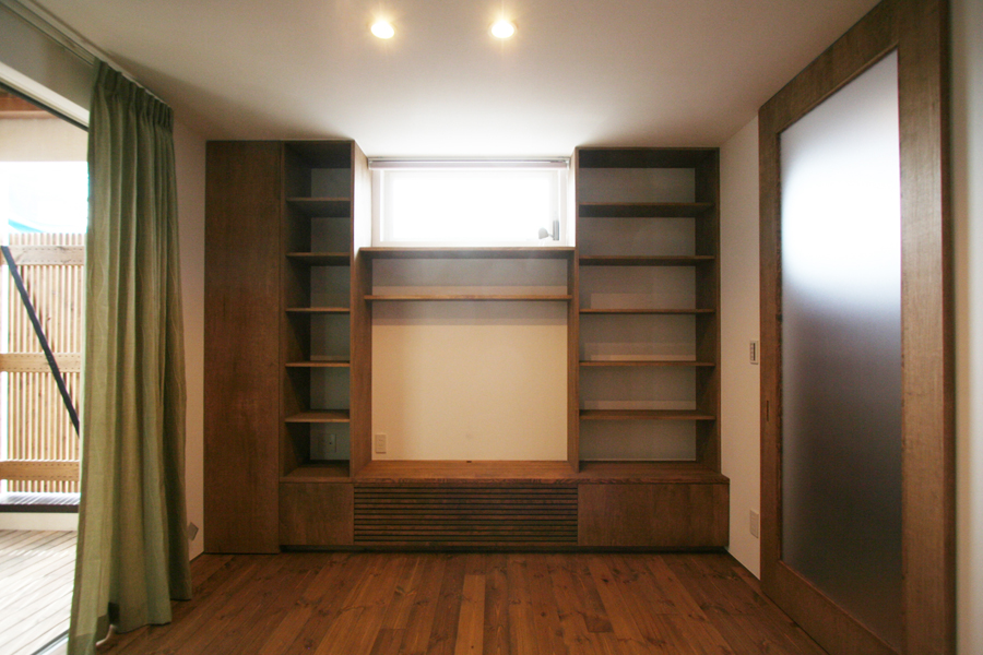 壁面いっぱいにつくった壁面収納は、カメラが趣味のお施主様の作品がずらりと並べられるようになっています。