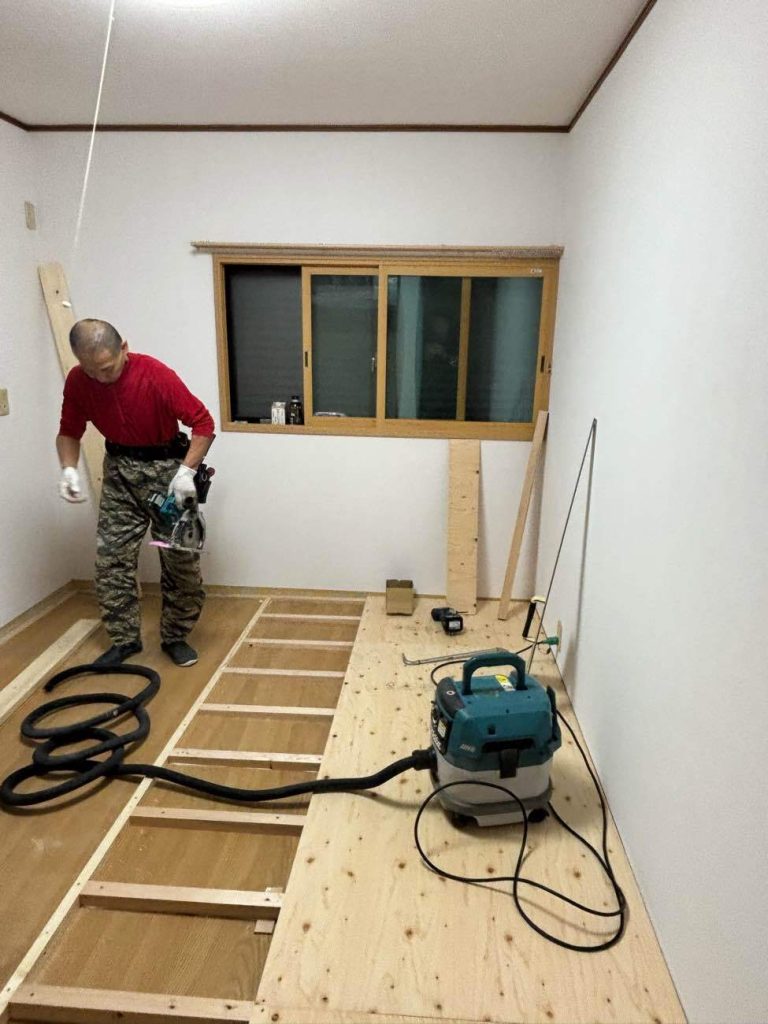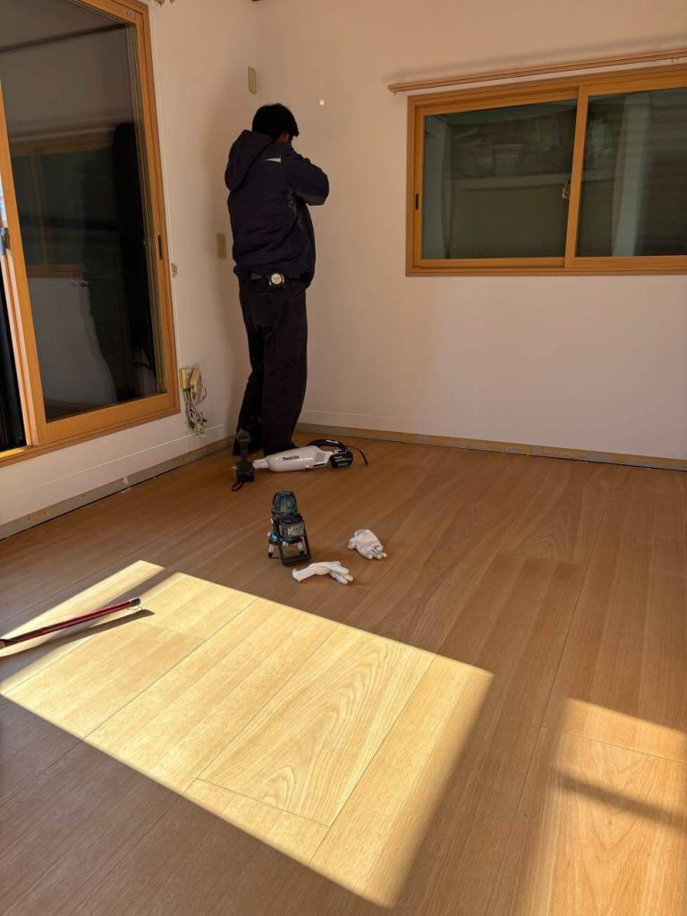 お部屋の床を一新し、安定した住空間へと改善しました。既存の床を解体したのち、新たに下地を整えてフローリングを施工。仕上がりは見た目に美しいだけでなく、歩行感が均一になり、安心して過ごせる空間へと生まれ変わりました。