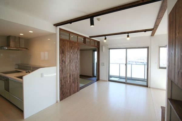 LDKはとてもまとまりがあり、統一感のある仕上がりとなっています。LDKからつながる階段の手前には建具をつくり、冷暖房効率を上げるために使用できるようになっています。