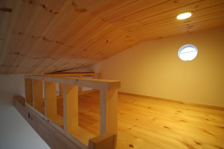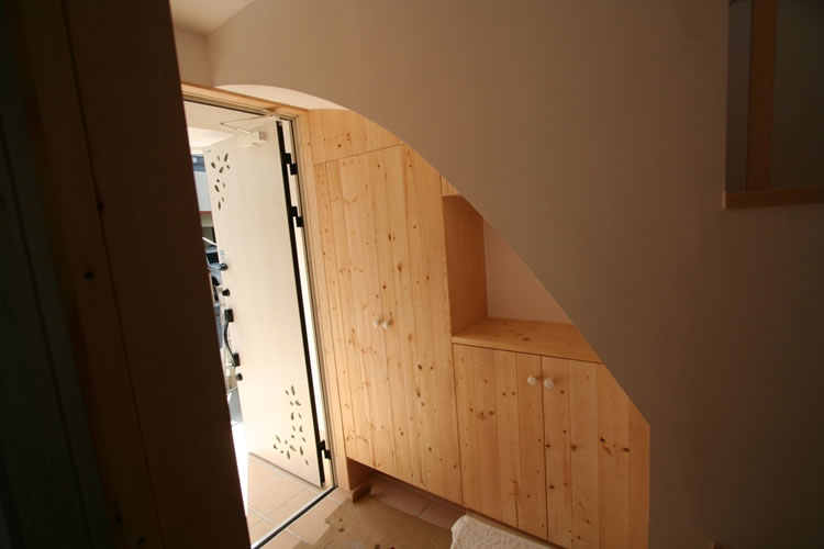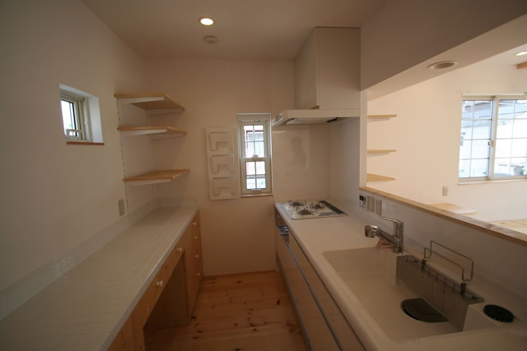 可愛らしい雰囲気が出るようにアールのデザインを随所に採用しました。外部はバルコニーの角をアール形状にし、丸い開口を設けました。内部も壁のポイントとして部分的にアール形状にし、ニッチの上部もアール形状にして可愛らしさを演出しました。床、建具、家具、一部天井の素材をクリア塗装したパイン材で統一し、柔らかさと可愛らしさをより引き立たせました。