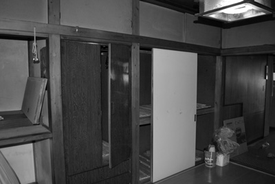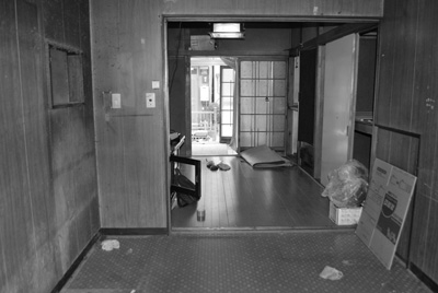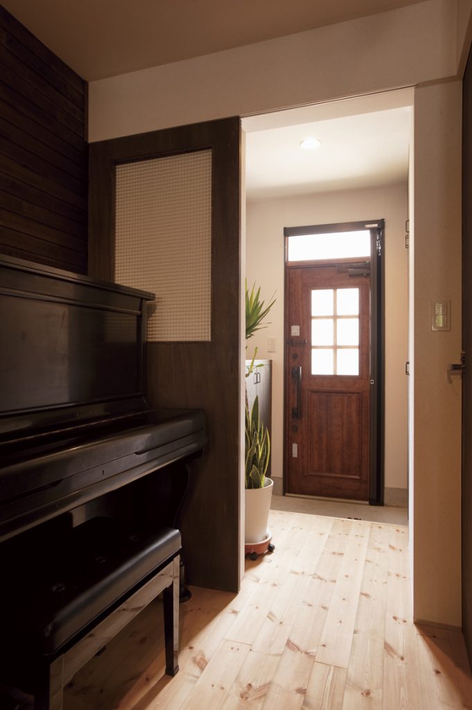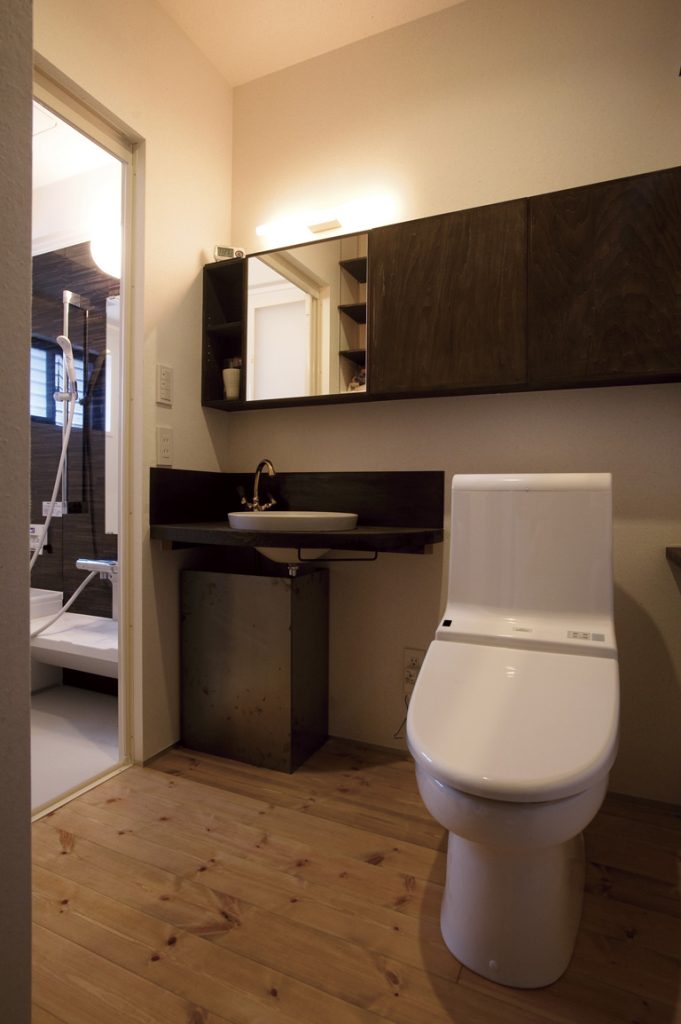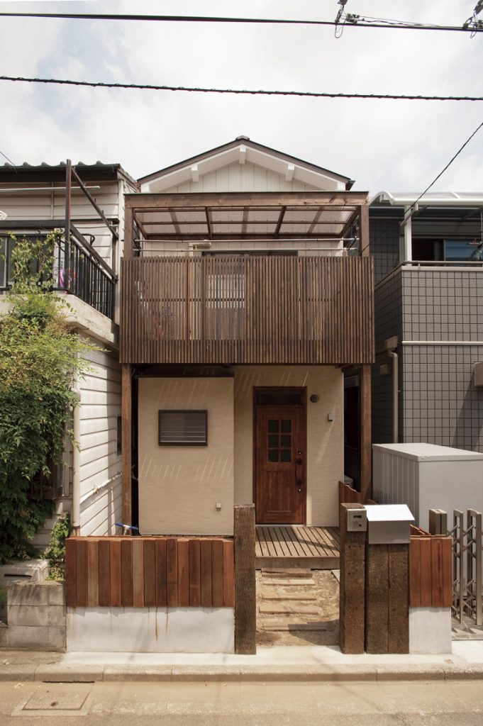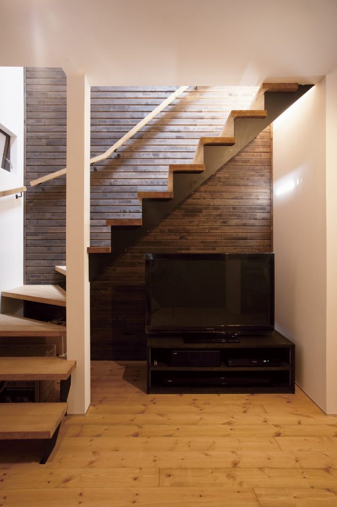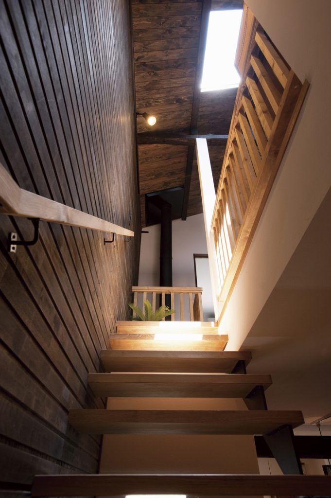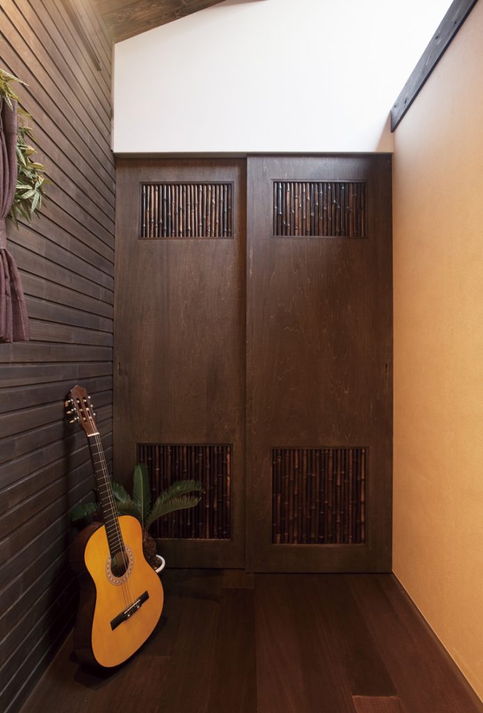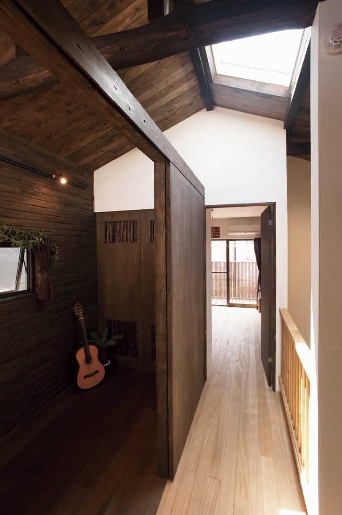 建具、家具、壁天井の一部は古色ブラックで塗装し古木調に仕上げ、ダークオーク色にしたフローリングが加わり全体を落ち着きのある空間にしています。主寝室の収納部のカーテン、エステルームの竹の建具はアジアンテイストのさらなる味付けとなっています。また、間口3m、長さ10 mの建物に光を入れる為に天窓を設けました。階段をストリップ階段にすることでその光はリビング、サニタリールームにそそがれ、風は北から南へ抜けるようになっています。