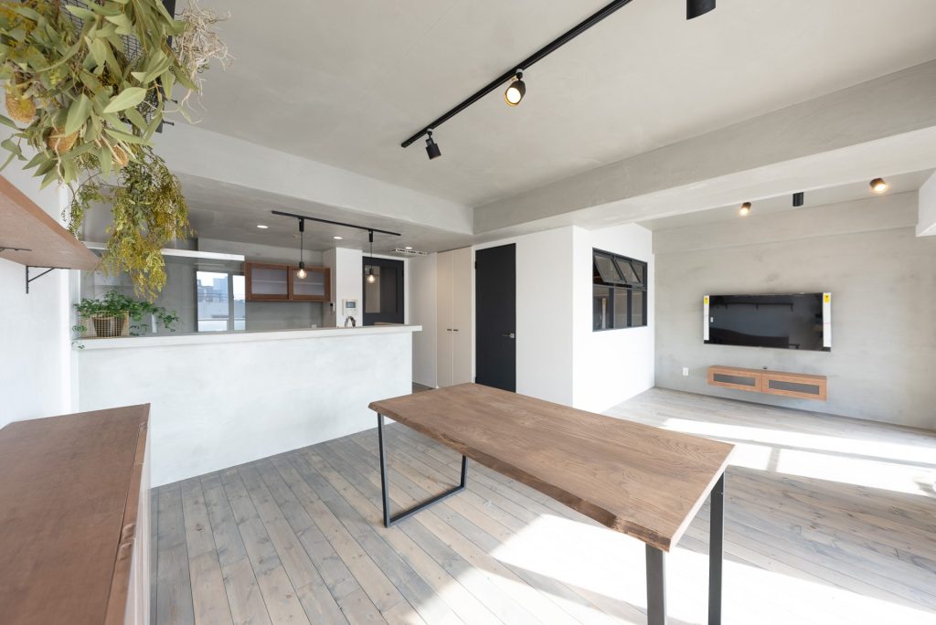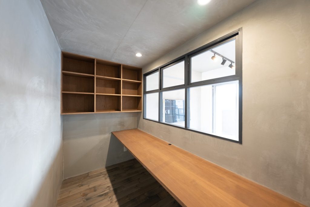 カフェ風がいいというご希望と、機能性を兼ね備えたマンションリノベーション。 内窓の設置や漆喰、モルタル、植栽などで質感も大切にすることで雰囲気を演出しました。 ワークスペースは内窓から光と風が通り抜け、小空間ながらも窮屈さを感じさせません。兄弟の部屋は稼働のスライドドアで仕切ることで、普段は開放的に、来客や勉強などプライベートを確保したいときなどは個別の空間にしたりとフレキシブルに変えられるのも魅力的! ロフトベッドやダイニングテーブルは自社工房でつくったオーダーメイド家具で、雰囲気に統一感が生まれてGOOD♪
