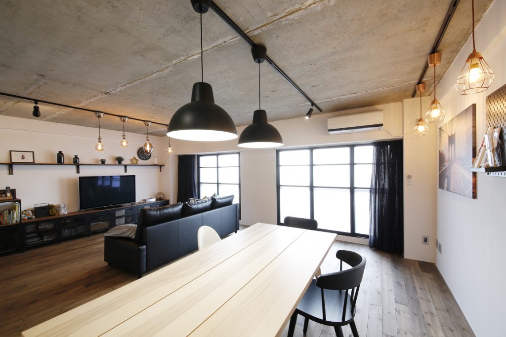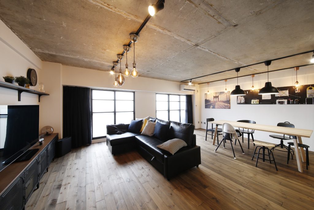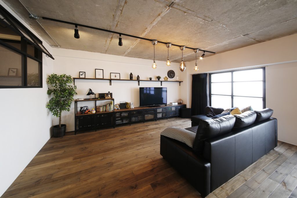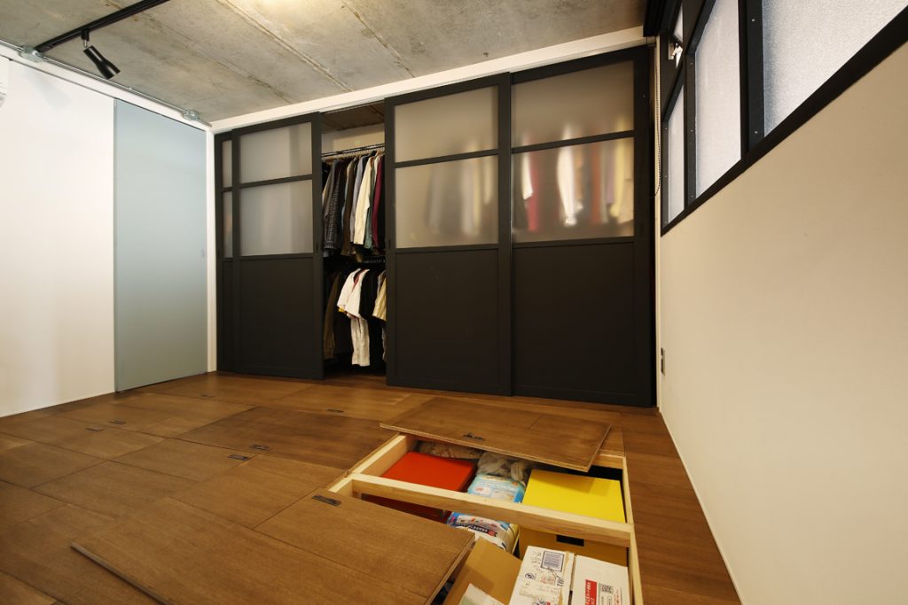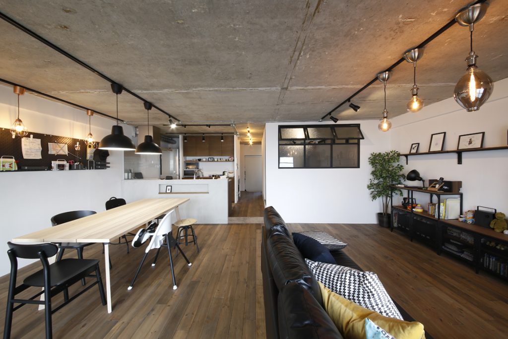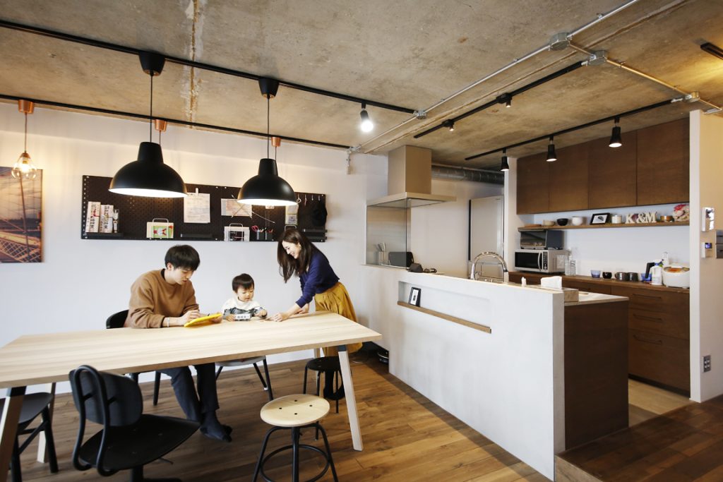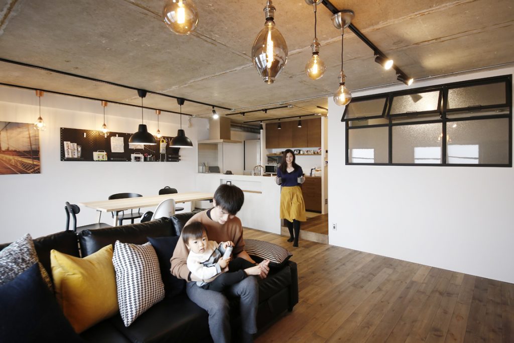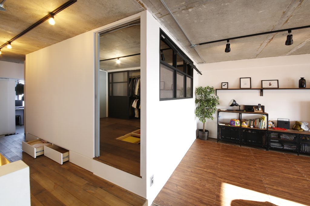 「限られた広さの中で将来的に可変性を持たせられる間取り」をコンセプトに始まったリノベーション。ビンテージの中古マンションをお探しのご主人ときれいなマンションがお好きな奥様。たくさんの物件をご案内させて頂き、お2人の納得がいく物件を見つけられました。広いLDKに実は収納たっぷりな小上がりの寝室スペース。家事のしやすい動線とデッドスペースを最大限に活用した収納で、限られた空間に広々リビングを実現しました。