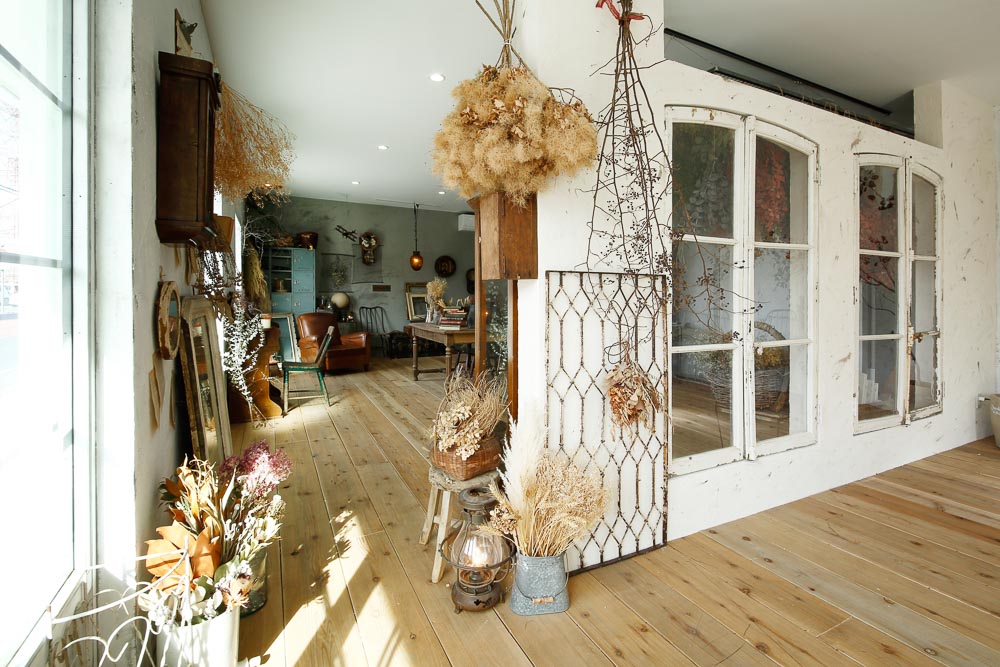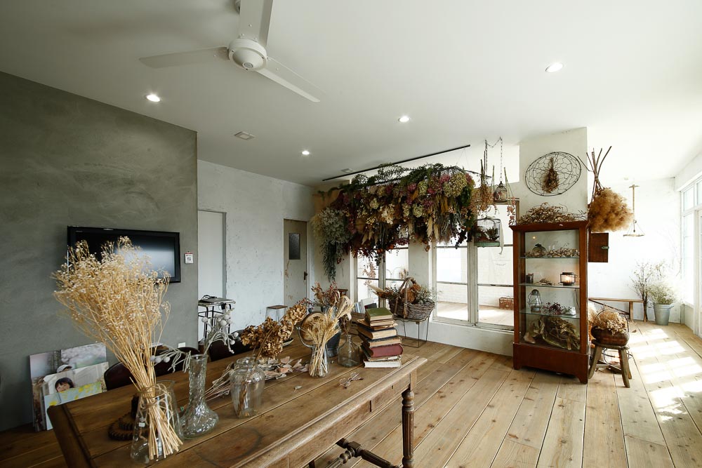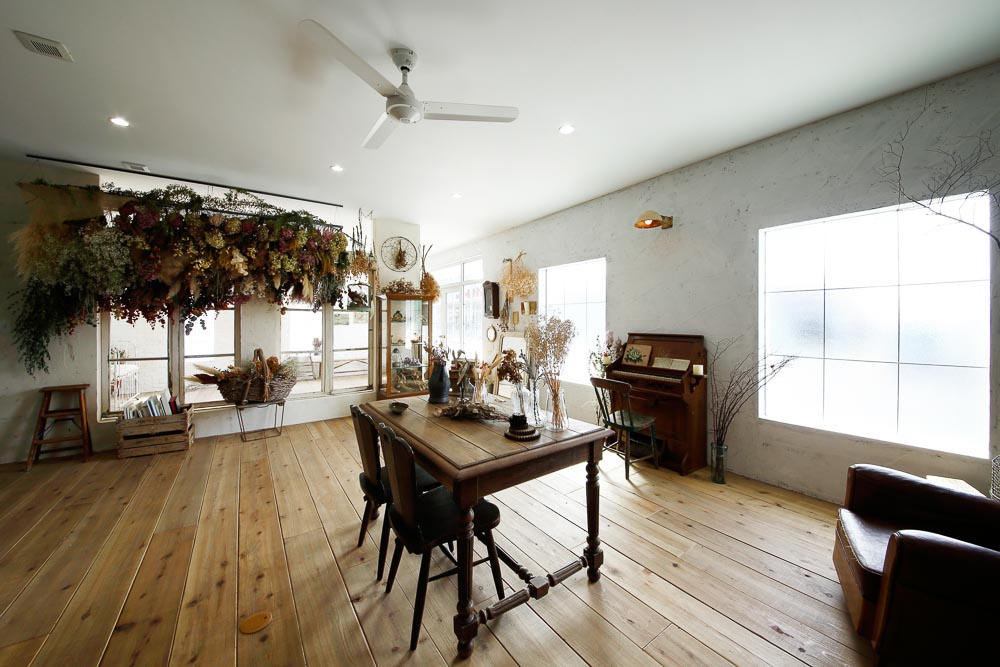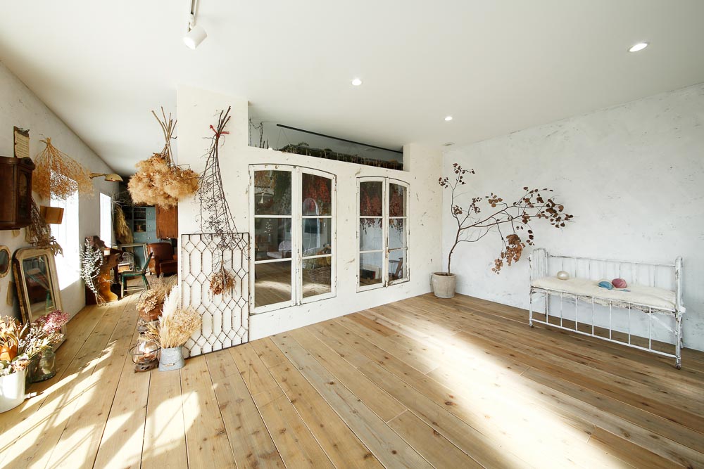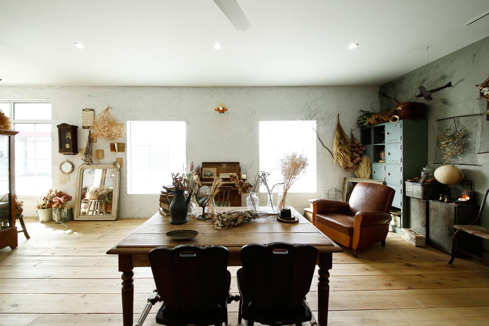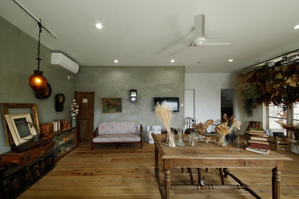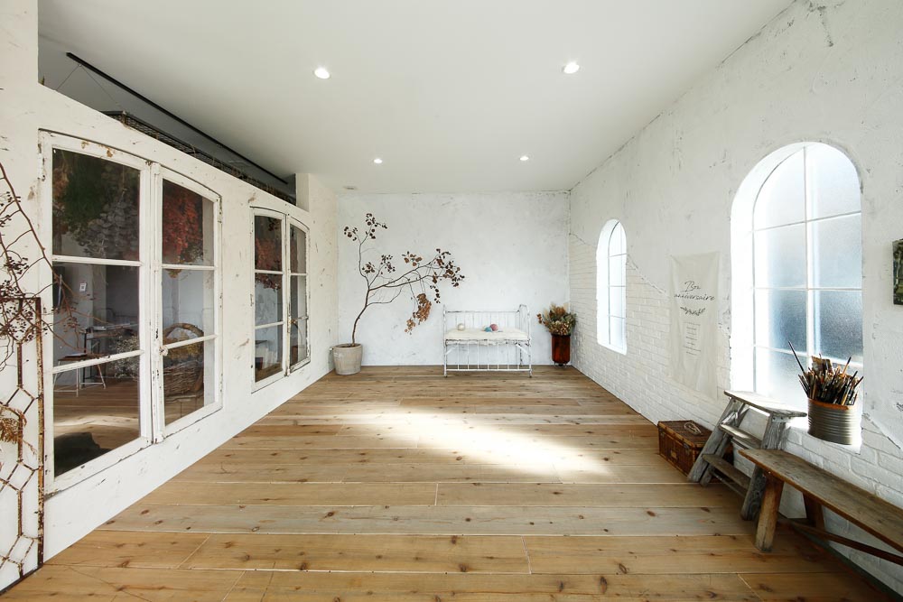 フォトスタジオならでは、ヴィンテージライクな仕上がりにするためにあえて味を加えた壁や床、たっぷりのドライフラワーやこだわったインテリアと、たくさんの表情を持たせることでセンス抜群の空間にまとまっています。