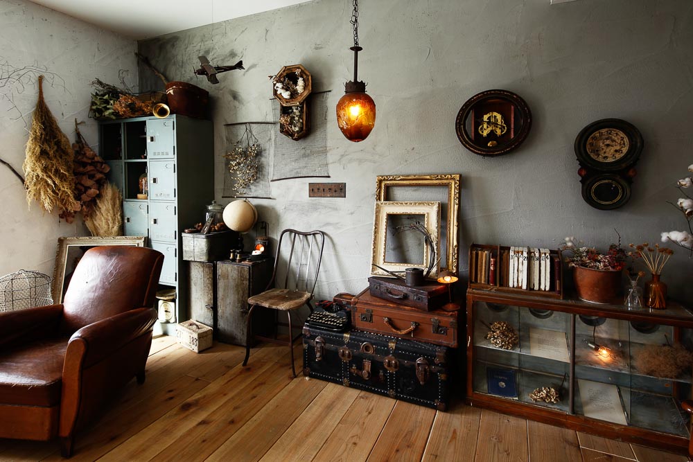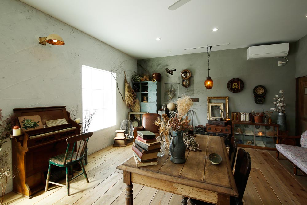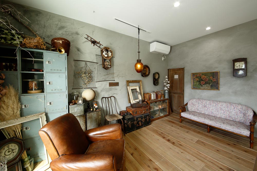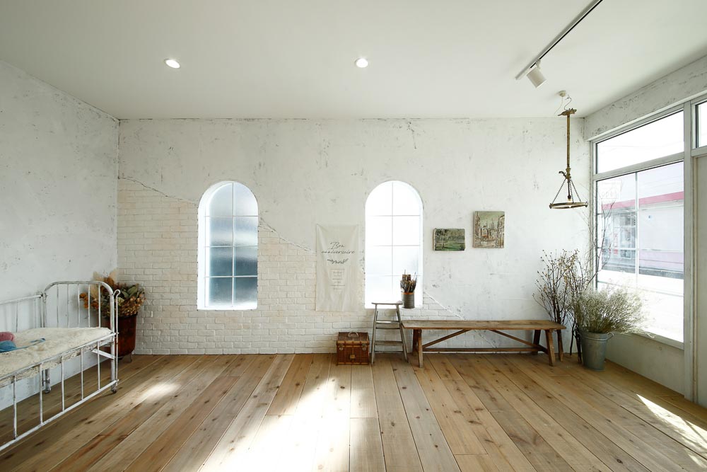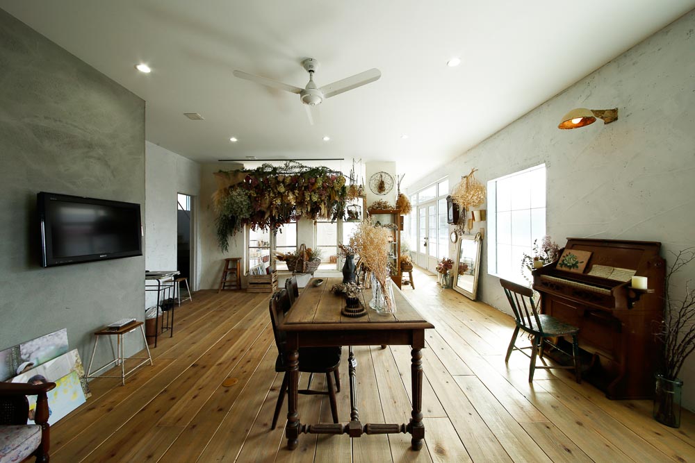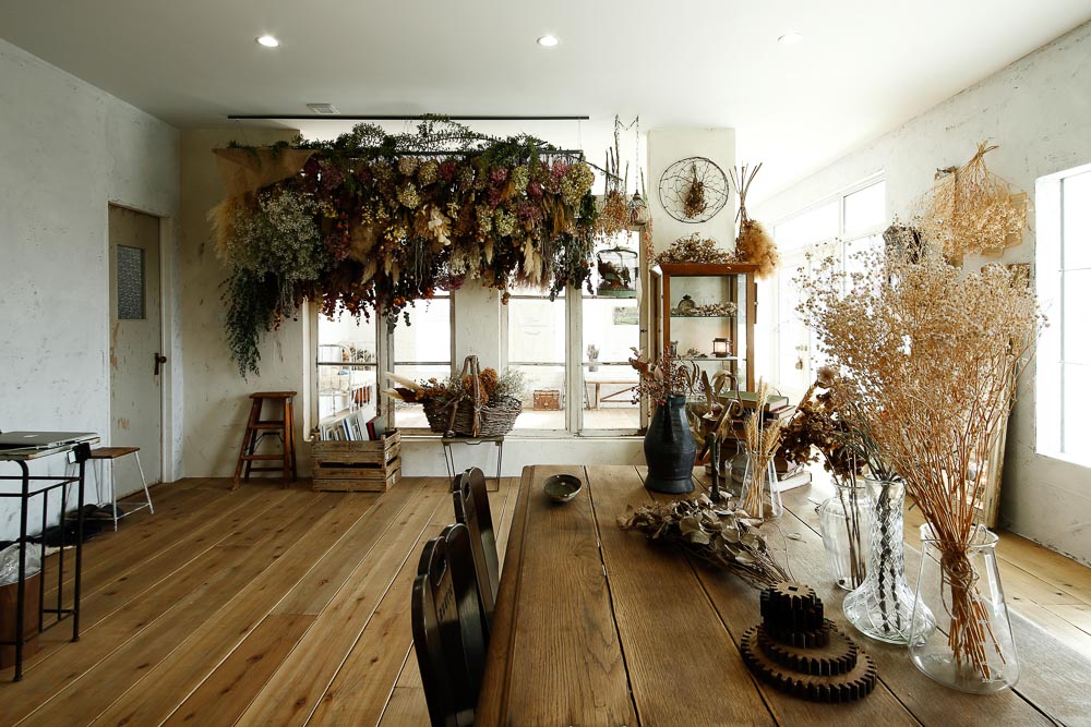 フォトスタジオならでは、ヴィンテージライクな仕上がりにするためにあえて味を加えた壁や床、たっぷりのドライフラワーやこだわったインテリアと、たくさんの表情を持たせることでセンス抜群の空間にまとまっています。