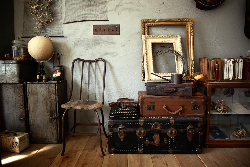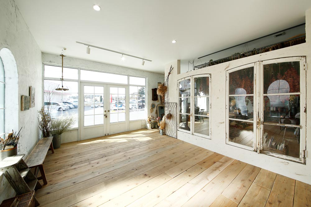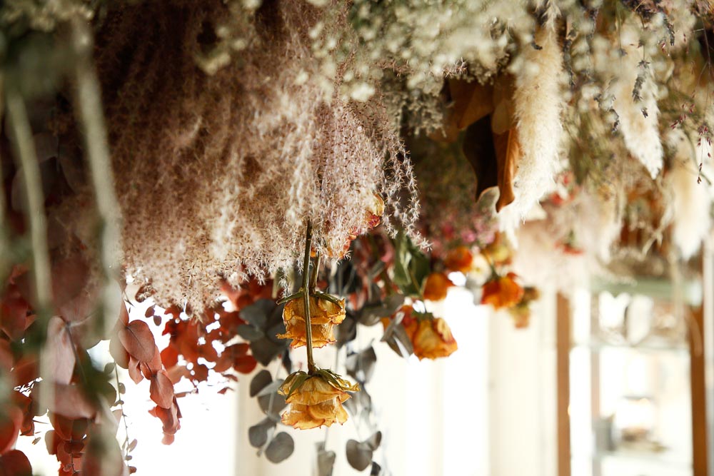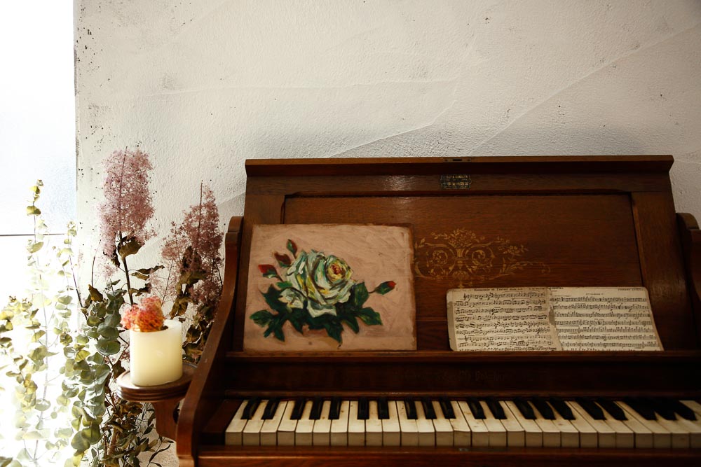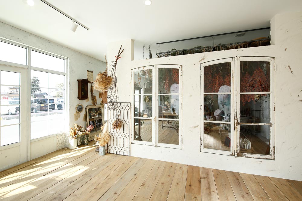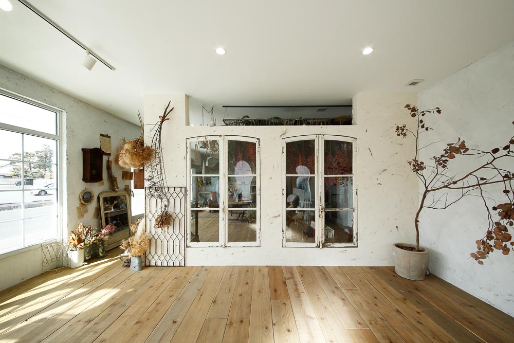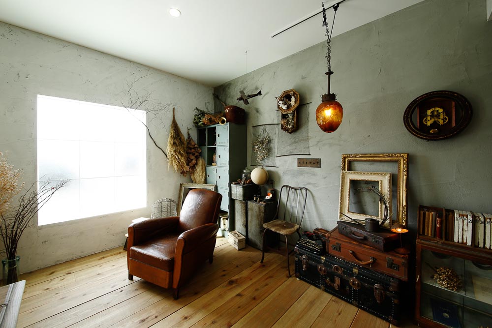 フォトスタジオならでは、ヴィンテージライクな仕上がりにするためにあえて味を加えた壁や床、たっぷりのドライフラワーやこだわったインテリアと、たくさんの表情を持たせることでセンス抜群の空間にまとまっています。