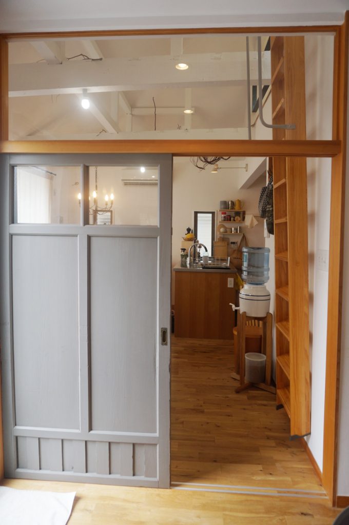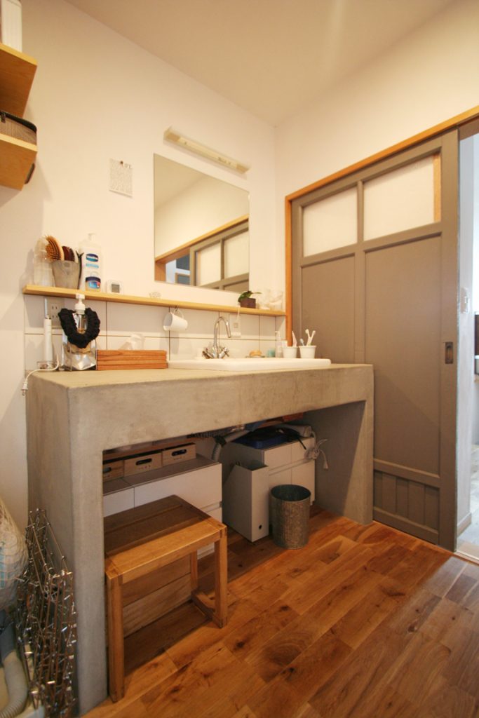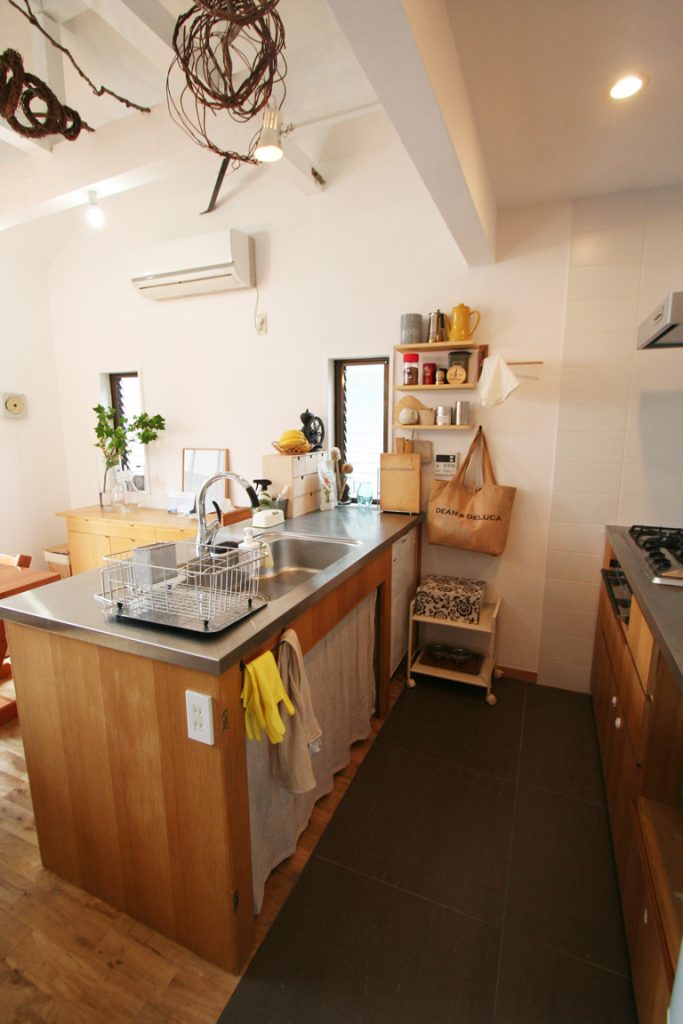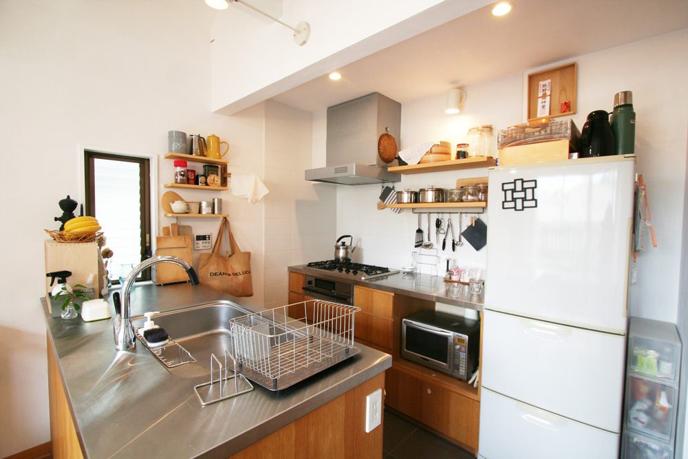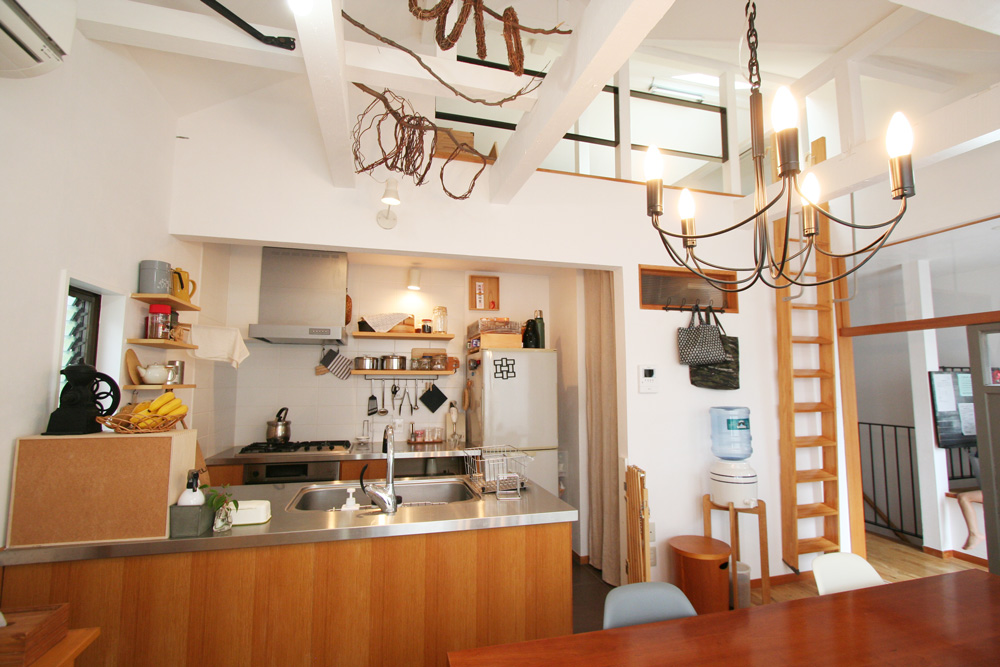 モルタル造りの洗面台、オークションで手に入れたレトロな建具、スイッチプレートやタオル掛けなどの小物などを設計に組み込んで、レトロな暖かい雰囲気を取り入れました。とりわけ築40 年以上の和室を残してリニューアルした多目的スペースはフラワーアレンジ教室を開いて賑わうことでしょう。天井を抜いて開放的なリビングキッチンの空間は、ステンレスとオークの組み合わせで、cafe スタイルに仕上がっています。